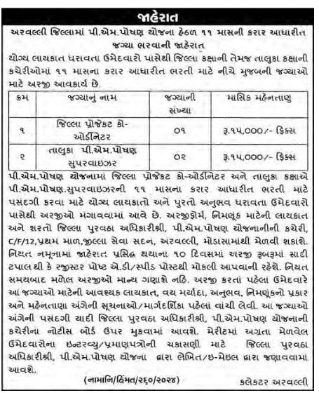 Aravalli પી.એમ,પોષણ યોજનામાં જિલ્લા પ્રોજેકટ કો-ઓર્ડીનેટર અને તાલુકા કક્ષાએ પી.એમ.પોષણ સુપરવાઇઝરની ૧૧ માસના કરાર આધારીત ભરતી માટે પસંદગી કરવા માટે યોગ્ય લાયકાતો અને પુરતો અનુભવ ધરાવતા ઉમેદવારો પાસેથી અરજીઓ મગાવવામાં આવે છે. અરજીફોર્મ, નિમણૂક માટેની લાયકાત અને શરતો જિલ્લા પુરવઠા અધિકારીશ્રી, પી.એમ.પોષણ યોજનાનીની કચેરી, C/F/12,પ્રથમ માળ,જીલ્લા સેવા સદન, અરવલ્લી, મોડાસામાંથી મેળવી શકાશે. નિયત નમૂનામાં જાહેરાત પ્રસિદ્ધ થયાના ૧૦ દિવસમાં અરજી રૂબરૂમાં સાદી ટપાલથી કે રજીસ્ટર પોષ્ટ એ.ડી. સ્પીડ પોસ્ટથી મોકલી આપવાની રહેશે.
