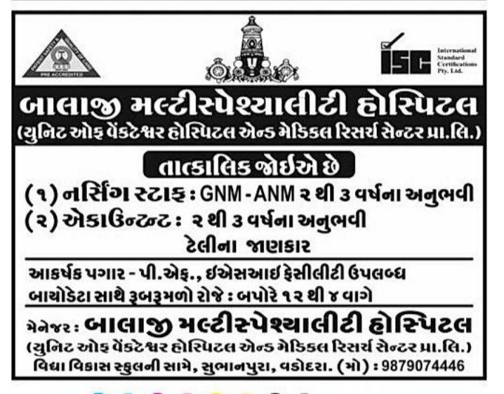 Balaji Multispecialty Hospital Vadodara Recruitment 2024