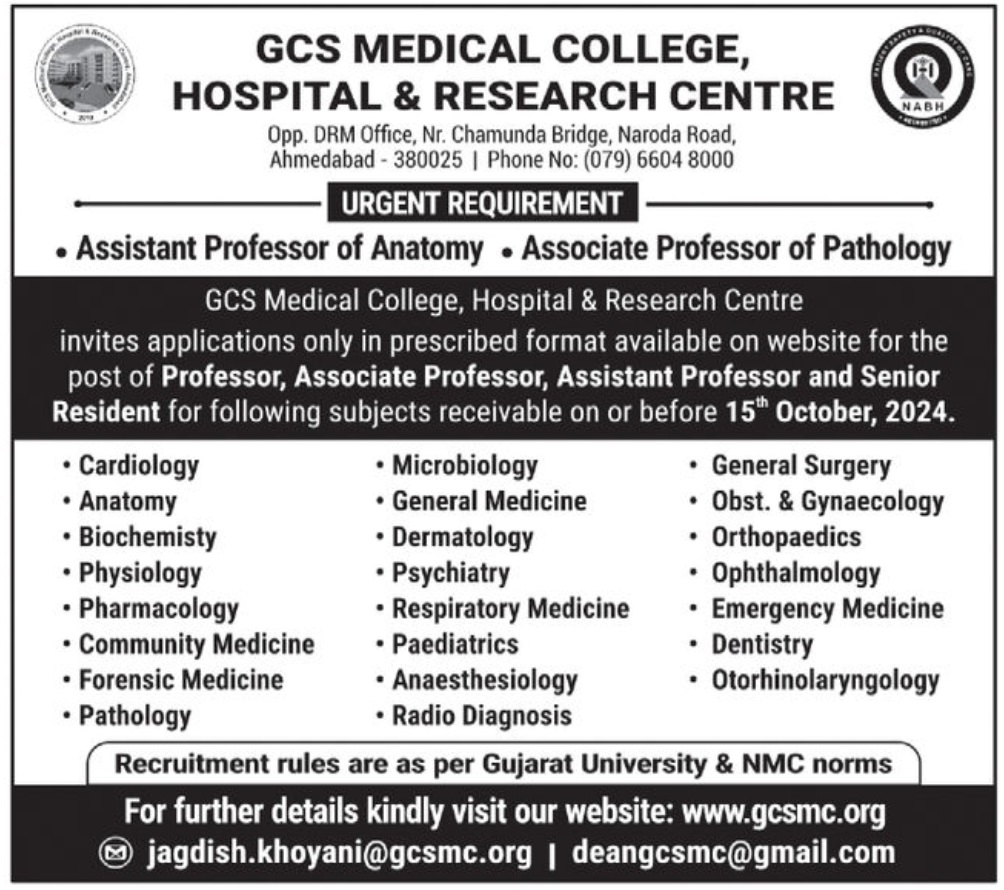 GCS Medical College, Hospital & Research Centre (G.C.S. Medical College, Hospital & Research Centre Recruitment 2024) has announced openings for Professor, Assistant Professor, and Associate Professor positions. Interested and eligible candidates are encouraged to review the official notification and submit their applications accordingly.