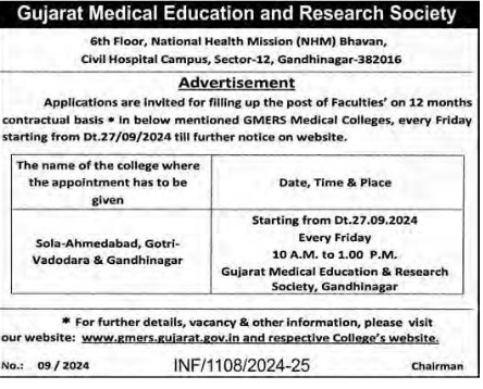 Applications are invited for filling up the post of Faculties’ on 12 months contractual basis in below mentioned GMERS Medical Colleges, every Friday starting from Dt.27/09/2024 till further notice on website.