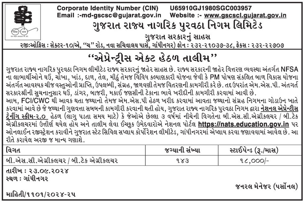 આમ, FCI/CWC થી આવક થતા જથ્થાનો તેમજ એમ.એસ.પી હેઠળ ખરીદ કરવામાં આવતા જથ્થાનો સંગ્રહ નિગમના ગોડાઉન ખાતે ક૨વામાં આવે છે જે જથ્થાની ગુણવત્તા સબબની કામગીરી કરવાની થતી હોય, ગુજરાત રાજ્ય નાગરિક પુરવઠા નિગમ દ્વારા નેશનલ એપ્રેન્ટીસ ટ્રેનીંગ સ્કીમ-૨.૦ હેઠળ (લાગુ પડતા સમય માટે) કે જેઓએ છેલ્લા ૩ વર્ષમાં નીચેની વિગતેના બી.એસ.સી.એગ્રીકલચર / બી.ટેક એગ્રીકલચરમાં ઉત્તીર્ણ થયેલ હોય અને તાલીમ લેવા ઈચ્છુક ઉમેદવારોએ નેશનલ પોર્ટલ https://nats.education.gov.in પર ઓનલાઈન રજીસ્ટ્રેશન કરાવીને ગુજરાત સ્ટેટ સિવિલ સપ્લાય કોર્પોરેશન લીમીટેડ, ગાંધીનગરમાં એપ્લાય કરવા જણાવવામાં આવેલ છે. આ રીતે કરાયેલ અરજી જ માન્ય ગણાશે.
