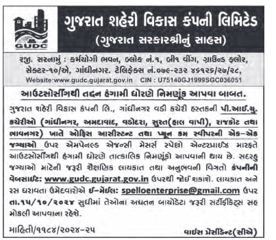 સદરહુ જગ્યાઓ માટેની જરૂરી શૈક્ષણિક લાયકાત તથા અનુભવની વિગતો કંપનીની વેબસાઈટ: www,gudc.gujarat.gov.in ઉપરથી જોઈ શકાશે. લાયકાત અને રસ ધરાવતા ઉમેદવારોએ ઈ-મેઈલ: spelloenterprise@gmail.com ઉપર તા.૧૫/૧૦/૨૦૨૪ સુધીમાં તેઓના અદ્યતન બાયોડેટા જરૂરી સર્ટીફીકેટ્સ સહ મોકલી આપવાના રહેશે. માહિતી/૧૧૮૪/૨૦૨૪-૨૫ વાઇસ પ્રેસીડેન્ટ(સીએ).