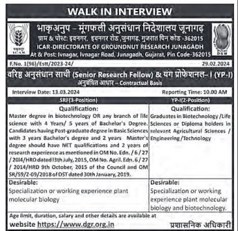 ICAR Directorate of Groundnut Research Recruitment : Eligible candidates are invited Walk-in-Interview for the position of Senior Research Fellow (SRF) & Young Professional-l under Genome Editing EFC Project. Contractual Basis Recruitment.