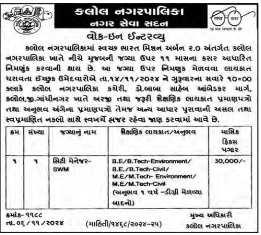આ જગ્યા ઉપર નિમણુક મેળવવા લાયકાત ધરાવતા ઈચ્છુક ઉમેદવારોએ તા.૧૪/૧૧/૨૦૨૪ ને ગુરૂવારના સવારે ૧૦=૦0 કલાકે કલોલ નગરપાલિકા કચેરી, ડો.બાબા સાહેબ આંબેડકર માર્ગ, કલોલ,જી.ગાંધીનગર ખાતે અરજી તથા જરૂરી શૈક્ષણિક લાયકાત પ્રમાણપત્રો તથા અનુભવ અંગેના પ્રમાણપત્રો તેમજ અન્ય આધાર પુરાવાની અસલ તથા સ્વપ્રમાણિત નકલો સાથે સ્વખર્ચે હાજર રહેવા જાણ કરવામાં આવે છે.