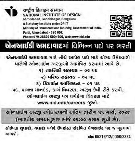 Online applications are invited from eligible candidates for the following posts for NID Ahmedabad.
