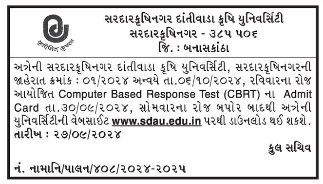 અત્રેની સરદારકૃષિનગર દાંતીવાડા કૃષિ યુનિવર્સિટી, સરદારકૃષિનગરની જાહેરાત ક્રમાંક : ૦૧/૨૦૨૪ અન્વયે તા.૦૬/૧૦/૨૦૨૪, રવિવારના રોજ આયોજિત Computer Based Response Test (CBRT) ના Admit Card તા.૩૦/૦૯/૨૦૨૪, સોમવારના રોજ બપોર બાદથી અત્રેની યુનિવર્સિટીની વેબસાઈટ www.sdau.edu.in ૫૨થી ડાઉનલોડ થઈ શકશે.