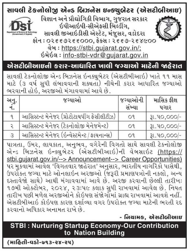 એસટીબીઆઇની કરાર-આધારિત ખાલી જગ્યાઓ માટેની જાહેરાત સાવલી ટેકનોલોજી એન્ડ બિઝનેસ ઇનક્યુબેટર (એસટીબીઆઇ) ખાતે ૧૧ માસ માટે (૩ વર્ષ સુધી લંબાવવાની શક્યતા) નીચેની કરાર આધારિત જગ્યાઓ ભરવાની હોઇ, અરજીઓ મંગાવવામાં આવે છે.