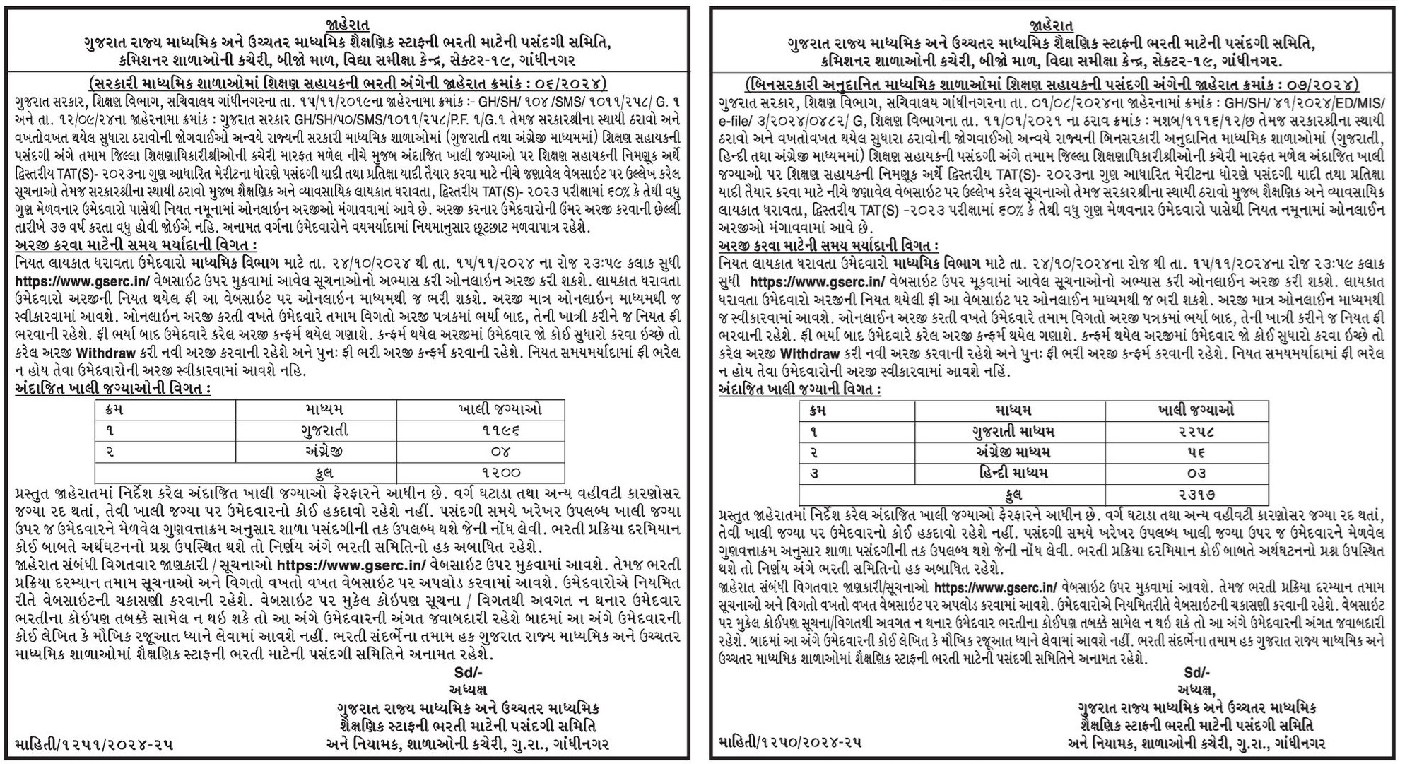 ગુજરાત રાજ્ય માધ્યમિક અને ઉચ્ચતર માધ્યમિક શૈક્ષણિક સ્ટાફની ભરતી માટેની પસંદગી સમિતિ, કમિશનર શાળાઓની કચેરી, બીજો માળ, વિદ્યા સમીક્ષા કેન્દ્ર, સેક્ટર-૧૯, ગાંધીનગર (સરકારી માધ્યમિક શાળાઓમાં શિક્ષણ સહાયકની ભરતી અંગેની જાહેરાત ક્રમાંક : ૦૬/૨૦૨૪)
