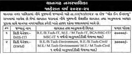 થાનગઢ નગર પાલિકામાં નીચે મુજબની જગ્યાઓ માટે તા.૦૪/૧૦/૨૦૨૪ ના રોજ “વોક ઈન ઈન્ટરવ્યુ” રાખવામાં આવેલ છે.જેમાં લાયકાત ધરાવતાં નીચે મુજબની શૈક્ષણીક લાયકાત તથા અનુભવના આધાર પુરાવા સાથે થાનગઢ નગરપાલિકા ક્ચેરી ખાતે હાજર રહેવા જણાવવામાં આવે છે.